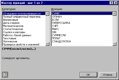 у діалоговому вікні, що з'явилося (мал.13), вибрати тип функції в переліку Категория і потім потрібну функцію в переліку Функция;