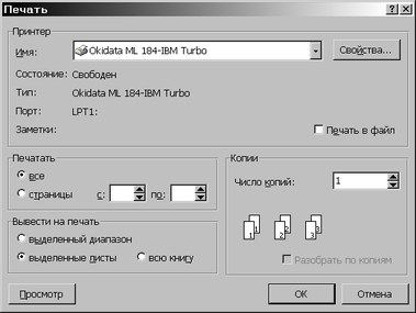 выделенные листы – друкувати виділені аркуші (для виділення 2-х і більше аркушів необхідно натискати мишею на їх ярлики при натиснутій клавіші Ctrl);