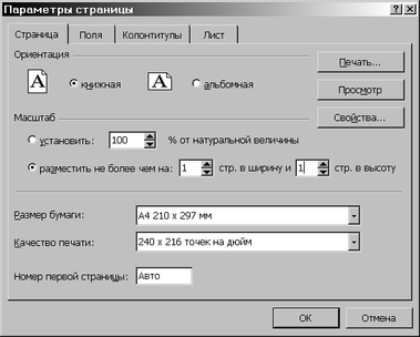 Перед друкуванням таблиць необхідно установити параметри сторінки за допомогою команди Параметры страницы меню Файл. В укладці Страница (мал.39) установлюється орієнтація і розміри аркушу паперу, масштаб зображення і якість друкування. У рамці Ориентация установлюється орієнтація аркушу: