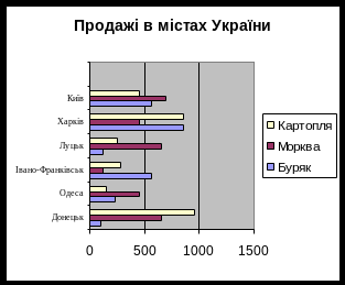 | Лінійчаста діаграма | Лінійчаста діаграма відображає співвідношення окремих компонентів. Категорії розташовані вздовж горизонталі, а значення — вздовж вертикалі. Таким чином, більша увага приділяється співставленню значень, і менша — змінам у часі. Лінійчаста діаграма з накопиченням відображає внесок окремих елементів в загальну суму | |