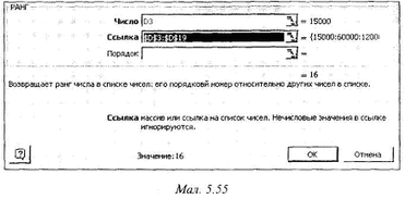 За допомогою функції РАНГ (мал. 7) у діапазоні клітинок з числами (поле Посилання) знаходиться порядковий номер вказаного числа відносно інших чисел розглядуваного діапазону.