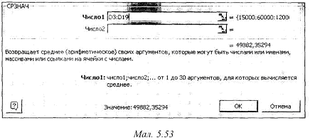 Наприклад, при виклику функції СЕРЗНАЧ діалогове вікно майстра функцій виглядає як на малюнку 5, в ньому дозволяється послідовно вводити кілька аргументів (число 1, число2, ...). кожний з яких може бути константою, посиланням на одну клітинку чи діапазон клітинок.