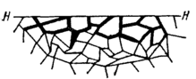 Некоторые сплавы подвержены своеобразному виду коррозии, протекающей только по границам кристаллитов (рис. 3), которые оказываются отделенными друг от друга тонким слоем продуктов коррозии (межкристаллитная коррозия). Здесь потери металла очень малы, но сплав теряет прочность. Это очень опасный вид коррозии, который нельзя обнаружить при наружном осмотре изделия.