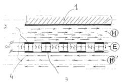 Физическая сущность разработанного способа заключается в следующем. Возбуждаемая в формирователе 4 датчика, поверхностная электромагнитная волна , со смещенной в область изолирующего покрытия 3, контролируемого объекта 1 энергией магнитного поля, практически нечувствительна к диэлектрической проницаемости и электромагнитным потерям материала изолирующего покрытия 3, а также к его проводимости. Смещение энергии магнитного поля достигается при противофазном возбуждении образующих формирователь 4 (рис. 2) импедансных проводников 2 и 3 (рис 4), имеющие идентичные размеры и конфигурации в виде повернутых на 180o зеркальных отображений друг друга. (рис. 6)