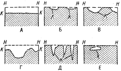 А – равномерная коррозия; Б – коррозия пятнами; В, Г – коррозия язвами; Д – точечная коррозия (питтинг); Е – подповерхностная коррозия; НН – исходная поверхность металла; КК – рельеф поверхности, измененный вследствие коррозии.