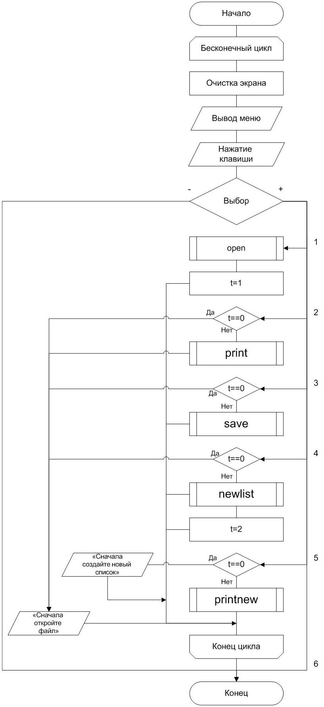 выбрали пункт меню №2 - запускается подпрограмма print – подпрограмма вывода записей на экран выбрали пункт меню №3 - запускается подпрограмма newlist – подпрограмма выполняет обработку списка выбрали пункт меню №4 - запускается подпрограмма printnew – подпрограмма вывода новых записей на экран.