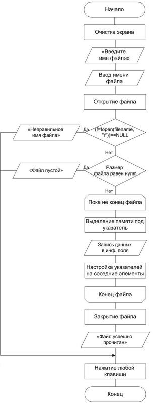 При выборе пункта №1, у пользователя запрашивается путь к исходному файлу, затем происходит чтение записей из исходного файла и создание в памяти из этих записей двунаправленного линейного списка;