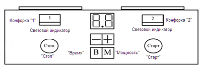 На панели изображены: семисегментный индикатор, который располагается в верхней части панели, также кнопки выбора конфорки, под ними – световые индикаторы конфорок, в нижней части панели располагаются все остальные кнопки, необходимые для управления электроплитой: старт, стоп, время, мощность, +, -.