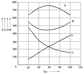На рисунке 1.3: Д – доход предприятия, определяется по формуле (1.16), Ф – целевая функция, А – амортизационные отчисления, С1 – затраты на охлаждение продукта, на сырьё, з/п и т.д.