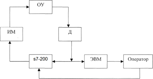 ОУ - объект управления; Д - датчик; s7-200 - ПМК; ИМ - исполнительный механизм; ЭВМ - вычислительная машина; Оператор - оператор ЭВМ.