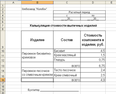 В практической части работы была решена экономическая задача по калькуляции стоимости выпечных изделий с помощью табличного процессора Microsoft Excel. Подробно описана последовательность действий по созданию выходной формы калькуляции. Тем самым показана простота и эффективность выполнения такого рода задач с помощью табличного процессора.