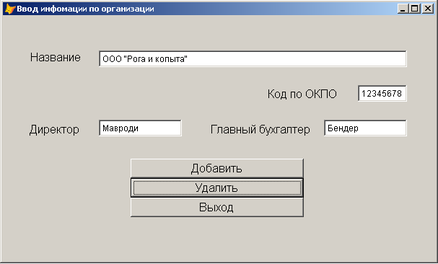 С помощью пункта меню «Настройка предприятия» можно вызвать экранную форму «Ввод информации по организации» (рисунок 2), в которой производится запись о названии предприятия, на котором применяется программа; код предприятия по ОКПО; фамилия, имя, отчество директора и главного бухгалтера предприятия.