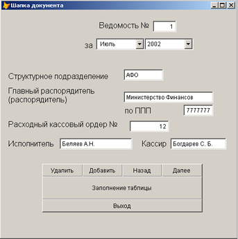 С помощью пункта меню «Настройка ведомости» (рисунок 3), можно вызвать экранную форму «Шапка документа» (рисунок 4), в которой вводится номер ведомости, дата формирования, структурное подразделение, главный распорядитель, номер распорядителя по ППП, номер расходного кассового ордера, также фамилия, имя, отчества кассира и исполнителя. Кроме кнопок добавления, добавления и просмотра записей, на экранной форме размещена копка «Заполнение таблицы», с помощью которой вызывается окно «Выдача денег» (рисунок 5).