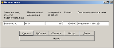 С помощью пункта меню «Выдача денег» (рисунок 5), можно вызвать экранную форму «Выдача денег» (рисунок 6), с помощью которой осуществляется управление списком подотчетных лиц, получающих средства. Здесь необходимо ввести фамилию, имя и отчество подотчетного лица, наименование учреждения, в котором он работает, номер счёта по дебету, сумму и дополнительные признаки.