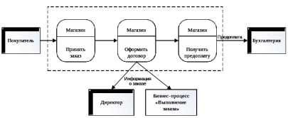 Бизнес процесс: «Оформление заказа» - Продавец принимает заказ от покупателя, оформляет договор, принимает предоплату. Предоплата передается в бухгалтерию. Информация о заказе поступает директору, и запускается следующий бизнес-процесс «Выполнение заказа».
