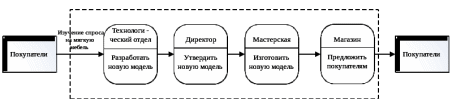 Дизайнер-технолог цеха, изучая спрос покупателей, создает новую модель мягкой мебели. Если директор одобряет новую модель, то проект передается в мастерскую для дальнейшего изготовления, а оттуда в магазин. Продавцы в магазине предлагают новую модель покупателям.
