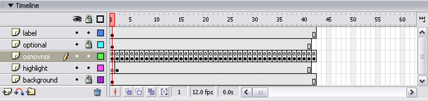 Как и традиционный фильм, видеоклип Flash разворачивается во времени. Центром управления содержимым Flash-фильма является панель Timeline (Временная шкала), позволяющая управлять содержимым, отображаемым в течение определенного времени в различных кадрах и ключевых кадрах. На панели Timeline, как показано на рисунке 2, "расквартированы" все кадры и слои, составляющие фильм, а также считывающая головка, являющаяся индикатором текущего кадра. В состав временной шкалы входят: