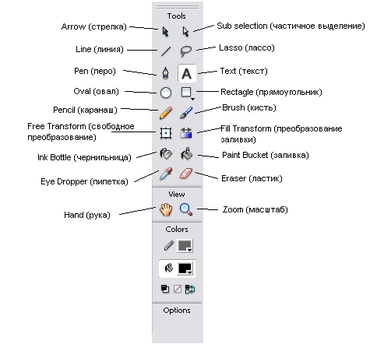 На этой панели, изображенной на рисунке 3, размещаются инструменты, предназначенные для работы во Flash. Данная панель подразделяется на четыре области: Tools (Инструменты), View (Вид), Colors (Цвета) и Options (Параметры). Некоторые из инструментов имеют модификаторы, отображаемые в области Options при их выборе.