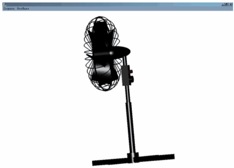 while(q { glBegin(GL_LINES); glVertex3f(0,(bFan+17)*sin(q*2*M_PI/rWeb),(bFan+17)*cos(q*2*M_PI/rWeb)); glVertex3f(0,(bFan+17)*sin((q+1)*2*M_PI/rWeb),(bFan+17)*cos((q+1)*2*M_PI/ rWeb)); glEnd(); q++; } Дуговая составляющая сетки где bFan+2 – радиус полуокружности, rWeb – разбиение окружности Фрагмент кода программы дуговой составляющей сетки int iWeb=0; while(iWeb { glBegin(GL_LINES); glVertex3f((bFan+2)*cos(iWeb*M_PI/rWeb),(bFan+2)*sin(iWeb*M_PI/rWeb)+15,0); glVertex3f((bFan+2)*cos((iWeb+1)*M_PI/rWeb),(bFan+2)*sin((iWeb+1)*M_PI/rWeb)+15,0); glEnd(); iWeb++; } Косой прут сетки где a, b – параметры отрезка Фрагмент кода программы косого прута сетки glBegin(GL_LINES); glVertex3f(bFan+2,15,0); glVertex3f(bFan,rFan,0); glEnd(); Винт Винт вентилятора составлен из трех основных частей Лопасть вентилятора где bFan – половина ширины лопасти в основании, lFan – длина лопасти, N – разбиение лопасти Фрагмент кода программы лопасти вентилятора double bFan=5; double lFan=15; glBindTexture(GL_TEXTURE_2D,texture4); float N=30; float NNN=100; int i=0; while(i { glBegin(GL_QUADS); glTexCoord2d(i/N,0); glNormal3f(-2*lFan*bFan*i/(N*N)*sin(i*M_PI/(1.5*N)), 2*bFan*bFan/(N*log(NNN))*(log(i+26)*i*sin(i*M_PI/(1.5*N))-log(i+25)*(i+1)*sin((i+1)*M_PI/(1.5*N))), 2*bFan*lFan*log(i+25)/(N*log(NNN))); glVertex3f(-bFan*log(i+25)/log(NNN),lFan*i/N,-bFan*(i)/N*sin(i*M_PI/(N*1.5))); glTexCoord2d(i/N,1); glNormal3f(-2*lFan*bFan*i/(N*N)*sin(i*M_PI/(1.5*N)), 2*bFan*bFan/(N*log(NNN))*(log(i+26)*i*sin(i*M_PI/(1.5*N))-log(i+25)*(i+1)*sin((i+1)*M_PI/(1.5*N))),2*bFan*lFan*log(i+25)/(N*log(NNN))); glVertex3f(bFan*log(i+25)/log(NNN),lFan*i/N,bFan*(i)/N*sin(i*M_PI/(N*1.5))); glTexCoord2d((i+1.0)/N,1); glNormal3f(-2*lFan*bFan*i/(N*N)*sin(i*M_PI/(1.5*N)), 2*bFan*bFan/(N*log(NNN))*(log(i+26)*i*sin(i*M_PI/(1.5*N))-log(i+25)*(i+1)*sin((i+1)*M_PI/(1.5*N))),2*bFan*lFan*log(i+25)/(N*log(NNN))); glVertex3f(bFan*log((i+26))/log(NNN),lFan*(i+1)/N,bFan*(i+1)/N*sin((i+1)*M_PI/(N*1.5))); glTexCoord2d((i+1.0)/N,0); glNormal3f(-2*lFan*bFan*i/(N*N)*sin(i*M_PI/(1.5*N)), 2*bFan*bFan/(N*log(NNN))*(log(i+26)*i*sin(i*M_PI/(1.5*N))-log(i+25)*(i+1)*sin((i+1)*M_PI/(1.5*N))),2*bFan*lFan*log(i+25)/(N*log(NNN))); glVertex3f(-bFan*log((i+26))/log(NNN),lFan*(i+1)/N, glEnd(); i++; } Цилиндр, объединяющий лопасти вентилятора в винт где M – разбиение цилиндра Фрагмент кода программы цилиндра, объединяющего лопасти вентилятора в винт M=30; int qRoll=0; glBindTexture(GL_TEXTURE_2D,texture2); while (qRoll { glBegin(GL_QUADS); glTexCoord2d(0,qRoll/M); glNormal3f(0,sin((2*M_PI*qRoll)/M),cos((2*M_PI*qRoll)/M)); glVertex3f(-1,sin((2*M_PI*qRoll)/M),cos((2*M_PI*qRoll)/M)); glTexCoord2d(0,(qRoll+1.0)/M); glNormal3f(0,sin((2*M_PI*(qRoll+1))/M),cos((2*M_PI*(qRoll+1))/M)); glVertex3f(-1,sin((2*M_PI*(qRoll+1))/M),cos((2*M_PI*(qRoll+1))/M)); glTexCoord2d(1,(qRoll+1.0)/M); glNormal3f(0,sin((2*M_PI*(qRoll+1))/M),cos((2*M_PI*(qRoll+1))/M)); glVertex3f(1,sin((2*M_PI*(qRoll+1))/M),cos((2*M_PI*(qRoll+1))/M)); glTexCoord2d(1,qRoll/M); glNormal3f(0,sin((2*M_PI*qRoll)/M),cos((2*M_PI*qRoll)/M)); glVertex3f(1,sin((2*M_PI*qRoll)/M),cos((2*M_PI*qRoll)/M)); glEnd(); qRoll++; } Крышка на цилиндр где M – разбиение круга Фрагмент кода программы цилиндра, объединяющего лопасти вентилятора в винт int M=30; int qFan=0; glBegin(GL_POLYGON); while (qFan { glNormal3f(1,0,0); if(qFan { glTexCoord2d(0,1-qFan*4/M); } if((qFan>=M/4)&&(qFan { glTexCoord2d((qFan-M/4)*4/M,0); } if((qFan>=M/2)&&(qFan<3*M/4)) { glTexCoord2d(1,(qFan-M/2)*4/M); } if(qFan>=3*M/4) { glTexCoord2d(1-(qFan-3*M/4)*4/M,1); } glVertex3f(1,sin((2*M_PI*qFan)/M),cos((2*M_PI*qFan)/M)); qFan++; } glEnd(); Стойка Стойка вентилятора составлена из трех основных частей Верхняя часть корпуса (полусфера) где rFan – наибольший радиус в фигуре, iM, M – разбиения полусферы Фрагмент кода программы верхней части корпуса (полусферы) M=30; int iM=30; double phi, psi; q=0; int i=0; while (q { while (i { glBindTexture(GL_TEXTURE_2D, texture2); glBegin(GL_QUADS); phi=(-(M_PI*(i))/iM); psi=((M_PI*(q))/M); glNormal3f(-3*rFan*sin(phi),rFan*cos(phi)*sin(psi),rFan*cos(phi)*cos(psi)); glTexCoord2d((sin(phi)+1)/2,(cos(psi)+1)/2); glVertex3d( phi=(-(M_PI*(i+1))/iM); psi=((M_PI*(q))/M); glNormal3f(-3*rFan*sin(phi),rFan*cos(phi)*sin(psi),rFan*cos(phi)*cos(psi)); glTexCoord2d((sin(phi)+1)/2,(cos(psi)+1)/2); glVertex3d( phi=(-(M_PI*(i+1))/iM); psi=((M_PI*(q+1))/M); glNormal3f(-3*rFan*sin(phi),rFan*cos(phi)*sin(psi),rFan*cos(phi)*cos(psi)); glTexCoord2d((sin(phi)+1)/2,(cos(psi)+1)/2); glVertex3d( phi=(-(M_PI*(i))/iM); psi=((M_PI*(q+1))/M); glNormal3f(-3*rFan*sin(phi),rFan*cos(phi)*sin(psi),rFan*cos(phi)*cos(psi)); glTexCoord2d((sin(phi)+1)/2,(cos(psi)+1)/2); glVertex3d( glEnd(); i++; } i=0; q++; } Цилиндрический элемент стойки Этот элемент стойки вентилятора состоит из цилиндров и кругов (крышки для цилиндров). Все они вызываются с помощью функции OpenGL – glCallList. Большая часть кода элементов вентилятора считывается программой лишь однажды, в СallLists, а вызов уже происходит неоднократно, 