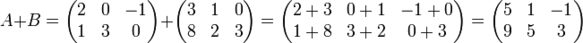 Сложение матриц A + B есть операция нахождения матрицы C, все элементы которой равны попарной сумме всех соответствующих элементов матриц A и B, то есть каждый элемент матрицы C равен