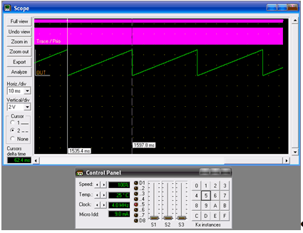 Чтобы поместить полученное значение в регистр сравнения, его необходимо округлить и преобразовать в шестнадцатеричную форму: k=$07A1. Так как почти все рассчитанные значения приходится округлять, это вызывает погрешности в формировании частоты. Анализируя полученные значения частот в пакете VMLAB, можно сделать вывод о том, что погрешности не превышают предел в 1%, который определён в задании.