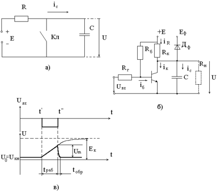 В простейшем случае, когда не требуется высокая линейность рабочего участка выходного напряжения, применяют заряд (рисунок 1.1,а) или разряд конденсатора через резистор R. После размыкания ключа Кл конденсатор заряжается по закону