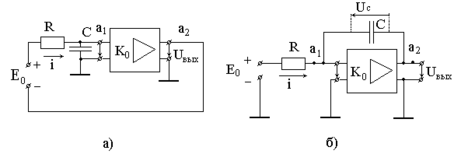 На рисунке 1.2,а показан вариант функциональной схемы компенсационного генератора с положительной обратной связью (ПОС): если коэффициент усиления усилителя К0=+1, то повышение потенциала в точке а1 при заряде конденсатора С компенсируется точно таким же повышением потенциала в точке а2, и зарядный ток i останется неизменным. Конечно, в практических схемах вследствие того, что коэффициент усиления К0 не остается в процессе работы постоянным и точно равным 1, а так же в результате нестабильности других параметров схем наблюдается определенное не постоянство тока i и большее или меньшее значение коэффициента нелинейности напряжения на конденсаторе и выходного напряжения uвых. Генератор, реализующий функциональную схему на рисунке 1.2,а, называют компенсационным генератором с ПОС.