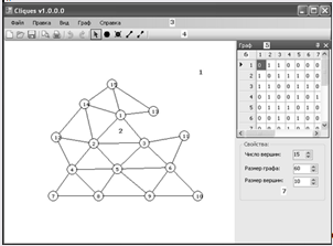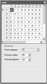 На рисунке 3 представлено окно "Граф", задачей которого ставится отображение матрицы и параметров графа. Оно позволяет добавлять и удалять вершины, а также устанавливать или удалять ребра графа. Окно является "плавающим" (Docking), что означает, что оно способно "прилипать" к краям главного окна, а также быть полностью независимым от него. Отобразить или скрыть это окно возможно при помощи функции меню Вид - > Окно свойств.