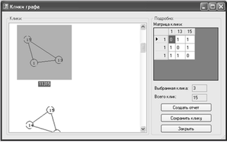 На рисунке 4 представлено окно "Клики графа", задачей которого ставится поиск и отображения всех клик графа, а также сохранение отдельных клик в графический, текстовый или графовый (*.g) файл, а также создание отчета обо всех найденных кликах. Доступ к окну можно получить из меня Граф -> Операции -> Поиск клик. Следует отметить, что если граф не создан или в нем отсутствуют клики, пользователь не получит доступ к окну, получив соответствующее уведомление.