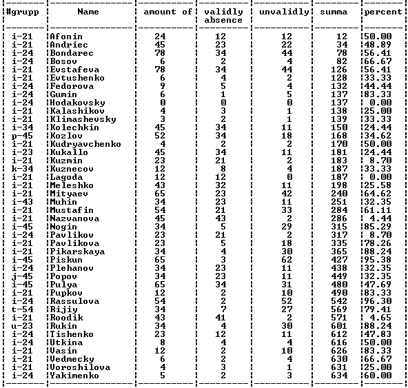 Данная программа предназначена для удобной обработки информации, содержащей сведения о студентах, код группы, фамилия студента, количество пропущенных занятий и число оправданных пропусков, составления и вывода на экран и в файл отчётных таблиц, задаваемый пользователем.