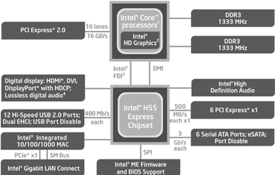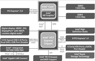 P55 отличия новичка оказались минимальны. Сохранилась архитектура (одна микросхема, без разделения на северный и южный мосты — де-факто это как раз южный мост), осталась без изменений вся традиционная "периферийная" функциональность. Первое отличие состоит в реализации у H57 специализированного интерфейса FDI, по которому процессор пересылает сформированную картинку экрана (будь то десктоп Windows с окнами приложений, полноэкранная демонстрация фильма или 3D-игры), а задача чипсета — предварительно сконфигурировав устройства отображения, обеспечить своевременный вывод этой картинки на [нужный] экран (Intel HD Graphics поддерживает до двух мониторов. Впрочем, в само́м факте дополнительных интерфейсов между процессором и чипсетом (ранее — между мостами чипсета) ничего нового нет, а когда мы говорим о шине DMI как о единственном соответствующем канале связи, то имеем в виду лишь основной канал для передачи данных широкого профиля, не более, а некие узкоспециализированные интерфейсы существовали всегда.