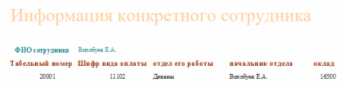 | Поле: | ФИО сотрудника | Табельный номер | Шифр вида оплаты | Отдел его работы |