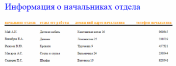 | Отдел его работы | Начальник отдела | Адрес начальника | Телефон начальника |