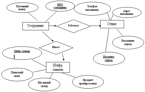“Сотрудники” с атрибутами: ФИО сотрудника, табельный номер, шифр вида оплаты, отдел его работы.
