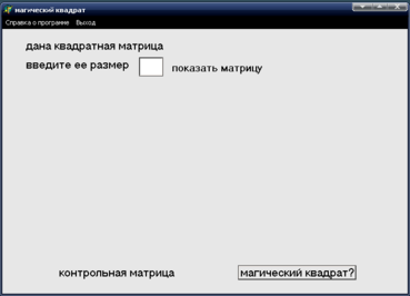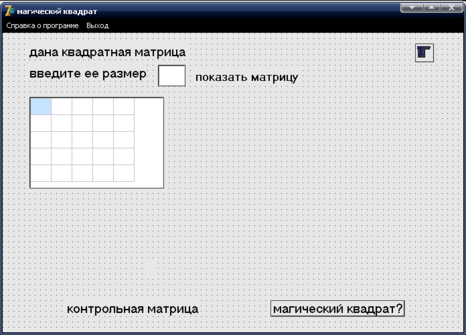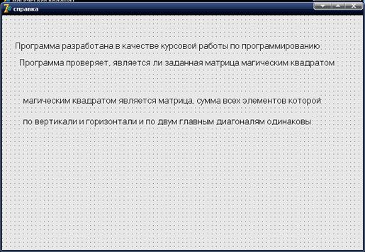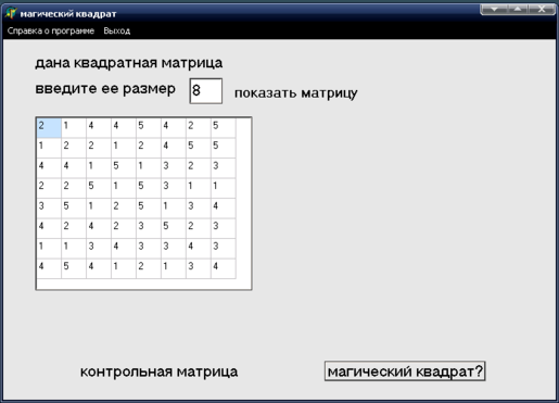 Программа запускается нажатием на файл Magi.exe. На открывающем окне формы расположен меню MainMenu, через которого можно открыть справки, помощь и закрыть программу. Ввод данных осуществляется с помощью случайных чисел. Нажатие на метку Показать вызывает процедуры формирования матрицы. Элементы матрицы и контрольной матрицы загружаются для отображения на форме в компонент StringGrid1.