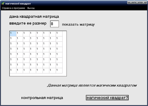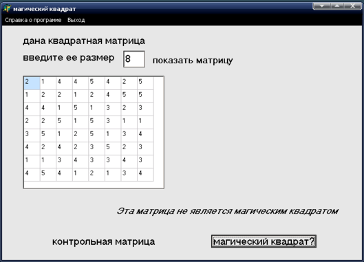 Входная информация по задаче – целочисленная квадратная матрица. Выходная информация – сообщение о том, что матрица является или не является магическим квадратом.