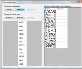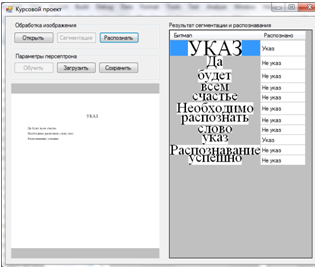 Перед непосредственным распознаванием текста необходимо произвести обучение персептрона, нажав кнопку "обучить", либо загрузить ранее сохраненные параметры, нажав кнопку "загрузить". Обучение персептрона осуществляется изображением содержащим слово "Указ", написанное разными шрифтами. После обучения, можно сохранить параметры персептрона в файл, нажав "сохранить", и прочитать их при следующем распознавании.
