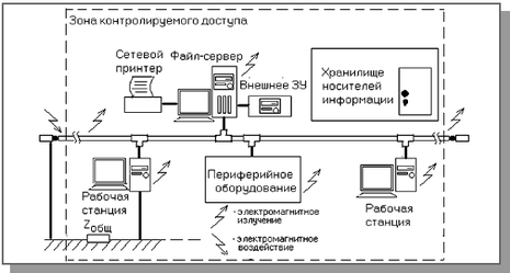 Остроту проблемы, связанной с большой протяженностью сети для одного из ее сегментов на коаксиальном кабеле, иллюстрирует Рисунок 2. В сети имеется много физических мест и каналов несанкционированного доступа к информации в сети. Каждое устройство в сети является потенциальным источником электромагнитного излучения (за исключением оптоволокна) из-за того, что соответствующие поля, особенно на высоких частотах, экранированы неидеально. Система заземления вместе с кабельной системой и сетью электропитания может служить каналом доступа к информации в сети, в том числе на участках, находящихся вне зоны контролируемого доступа и потому особенно уязвимых. Кроме электромагнитного излучения, потенциальную угрозу представляет бесконтактное электромагнитное воздействие на кабельную систему. Безусловно, в случае использования проводных соединений типа коаксиальных кабелей или витых пар возможно и непосредственное физическое подключение к кабельной системе. Если пароли для входа в сеть стали известны или подобраны, становится возможным несанкционированный вход в сеть с файл-сервера или с одной из рабочих станций. Наконец возможна утечка информации по каналам, находящимся вне сети: