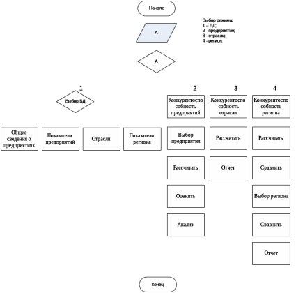 - осуществляется выбор действия – конкурентоспособность предпри-ятий, конкурентоспособность отрасли, конкурентоспособность региона. Схема работы системы приведена на рисунке 3.1.