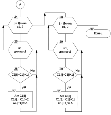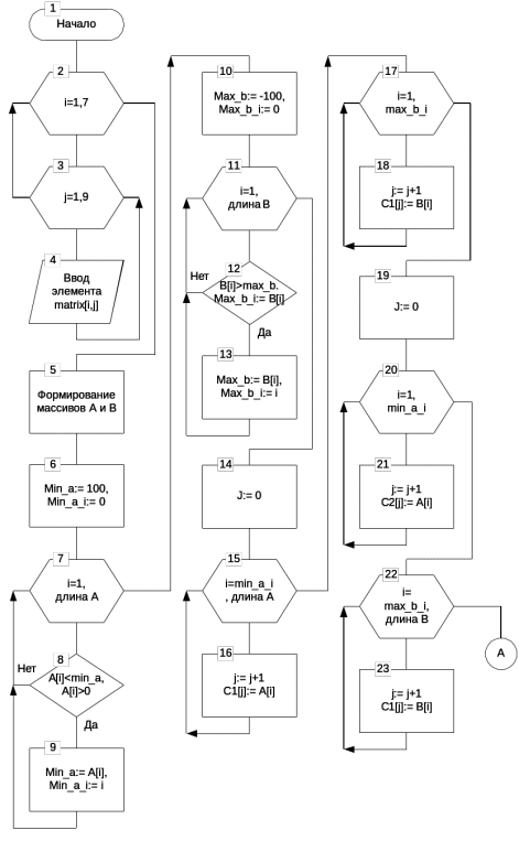 if (a[i]>0) and (a[i] begin min_a:= a[i]; min_a_i:= i; end; for i:= 1 to kol_b do if (b[i]max_b)then begin max_b:= b[i]; max_b_i:= i; end; end; procedure TForm1.buCClick(Sender: TObject); var i, j, k: integer; begin // формирование массивов с1 и с2 kol_c1:=0; for i:= min_a_i+1 to kol_a do begin kol_c1:= kol_c1+1; c1[kol_c1]:= a[i]; end; for i:= 1 to max_b_i do begin kol_c1:= kol_c1+1; c1[kol_c1]:= b[i]; end; kol_c2:=0; for i:= 1 to min_a_i do begin kol_c2:= kol_c2+1; c2[kol_c2]:= a[i]; end; for i:= max_b_i+1 to kol_b do begin kol_c2:= kol_c2+1; c2[kol_c2]:= b[i]; end; // сортировка массивов с1 и с2 for j:= kol_c1 downto 2 do for i:= 1 to kol_c1 do if c1[i] > c1[i+1] then begin k:=c1[i] ; c1[i]:=c1[i+1]; c1[i+1]:=k; end; for j:= kol_c2 downto 2 do for i:= 1 to kol_c2 do if c2[i] < c2[i+1] then begin k:=c2[i] ; c2[i]:=c2[i+1]; c2[i+1]:=k; end; // отображение с1 и с2 sgC1.ColCount:= kol_c1 + 1; for i:= 1 to kol_c1 do begin sgC1.Cells[i, 0]:= IntToStr(i); sgC1.Cells[i, 1]:= IntToStr(c1[i]); end; sgC2.ColCount:= kol_c2 + 1; for i:= 1 to kol_c2 do begin sgC2.Cells[i, 0]:= IntToStr(i); sgC2.Cells[i, 1]:= IntToStr(c2[i]); end; end; end.Характеристики