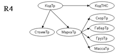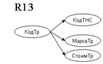 Т.к. возможный ключ не является детерминантом, необходима дальнейшая декомпозиция. Отношение R4 разделяем на R13 и R14. Для декомпозиции по правилу «цепочек» используем крайнюю правую ФЗ: МаркаТр СкорТр, ГабарТр, ГрузТр, МассаТр.