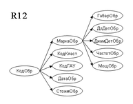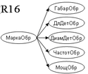 Т.к. возможный ключ не является детерминантом, необходима дальнейшая декомпозиция. Отношение R12 разделяем на R15 и R16. Для декомпозиции по правилу «цепочек» используем крайнюю правую ФЗ: МаркаОбр ГабарОбр, ДлДетОбр, ДиамДетОбр, ЧастотОбр, МощОбр.