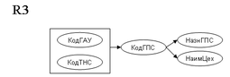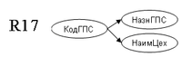 Т.к. возможный ключ не является детерминантом, необходима дальнейшая декомпозиция. Отношение R3 разделяем на R17 и R18. Для декомпозиции по правилу «цепочек» используем крайнюю правую ФЗ: КодГПС НазнГПС, НаимЦех.