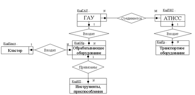 Каждое обрабатывающее оборудование может входить только в один кластер ГАУ, в каждый кластер может входить несколько оборудований, поэтому степень связи N:1. Класс принадлежности обеих сущностей – обязательный.