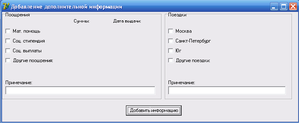 Появится окно добавления информации студенту (рис. ). Чтобы добавить информацию нужно поставить крестики напротив добавляемой информации. После выставления информации появляются дополнительные поля: “Суммы” и “Дата выдачи”. После их заполнения, чтобы изменения вступили в силу, необходимо нажать кнопку “Добавить информацию”. Чтобы вернуться в главное окно программы, нужно нажать “Отобразить все”.