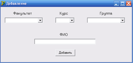 Чтобы добавить студента в таблицу необходимо выбрать меню “Правка”- “Добавить”. В появившемся окне (рис. 3) из выплывающего списка нужно выбрать факультет, курс и группу добавляемого студента. В поле ввода нужно вписать фамилию имя и отчество учащегося. После окончания ввода, нужно нажать кнопку “Добавить”.