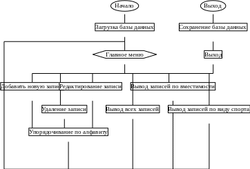 В основной программе осуществляется загрузка базы данных в массив и вывод главного меню. Далее пользователю предлагается выбрать один из пунктов: