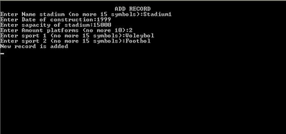Если пользователь выбрал добавление новой записи, ему предлагается заполнить все поля таблицы по очереди. Запись добавляется в конец таблицы, счетчик записей увеличивается на единицу, происходит упорядочивание записей по алфавиту.