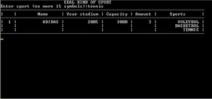 При выборе пункта 6, пользователю предоставляется ввод вида спорта. После этого на экран выведутся записи удовлетворяющие условию. В программе не учитывается регистр букв, т.к. все строки автоматически приводятся к верхнему регистру.