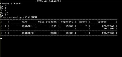При выборе пятого пункта пользователю предлагается сначала выбрать тип вместимости стадионов (равно, больше, меньше, больше или равно, меньше или равно), затем ввести вместимость, по которой хотите отфильтровать записи. После этого на экран выведутся записи удовлетворяющие условию.